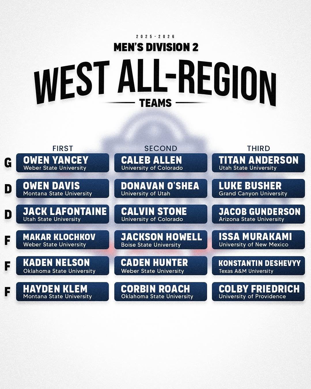 Congratulations to defenseman Owen Davis and forward Hayden Klem for being named to the ACHA 1st Team West All-Region Team!